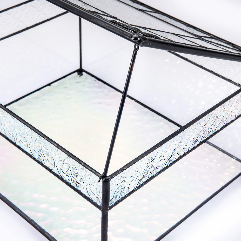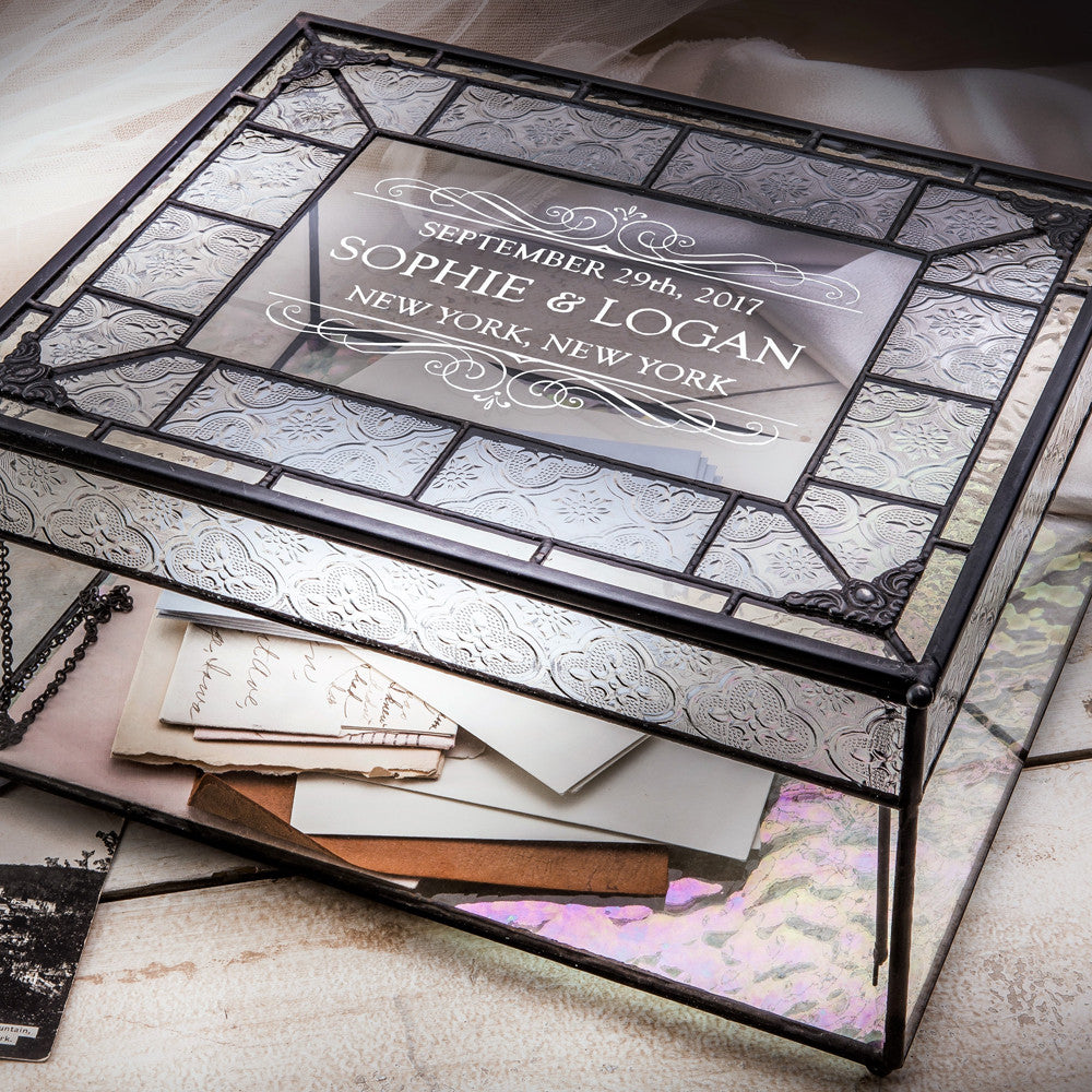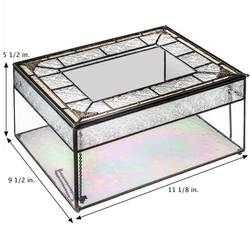 Featuring clear glass embossed with a vintage texture and a clear iridescent glass in the bottom that shimmers with soft color. Decorative metal trim, filigree corners, and round ball feet complete the vintage charm of this gift card box. The hinged lid has a chain on the inside and support bar to hold the top open.