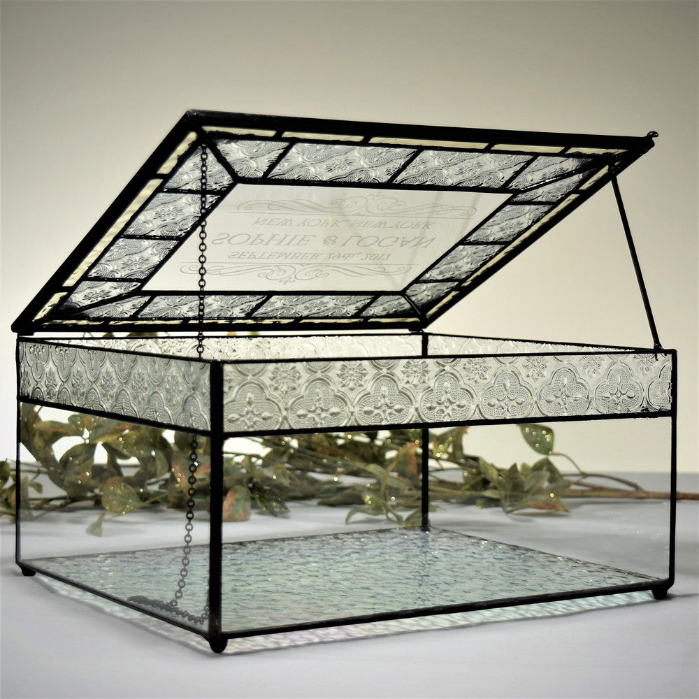 Personalize this large glass box to use as a wedding card box and use it afterwards to display keepsakes and flowers.