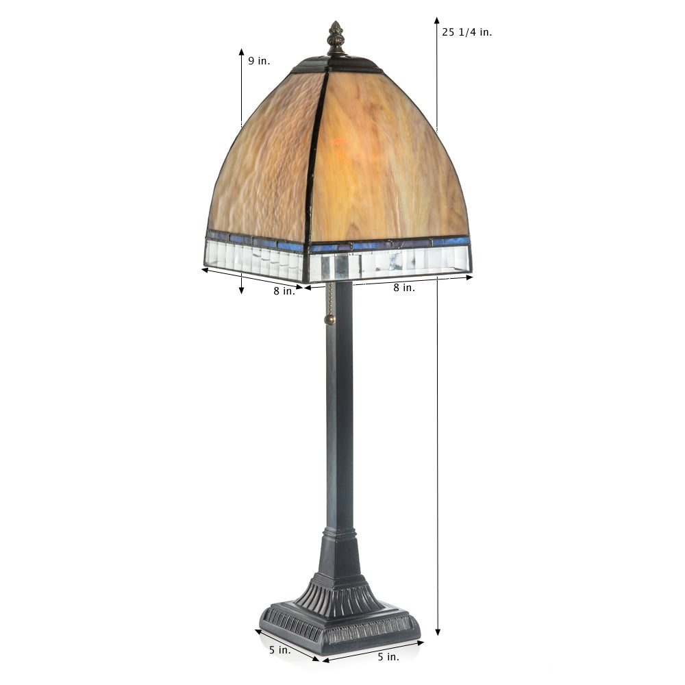 Using amber rose opalescent glass with a complimentary blue purple accent and finished with clear textured trim you will find this lamp easy to work into your home decor.
