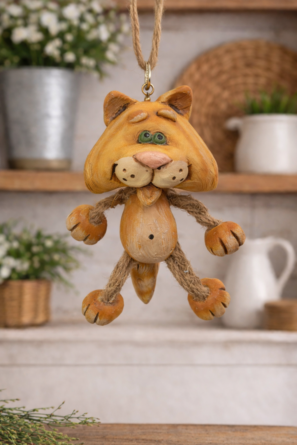 Whimsical orange tabby cat ornament by Bert Anderson with dangly legs and jute hanger. A charming farmhouse accent and perfect cat lover gift.
