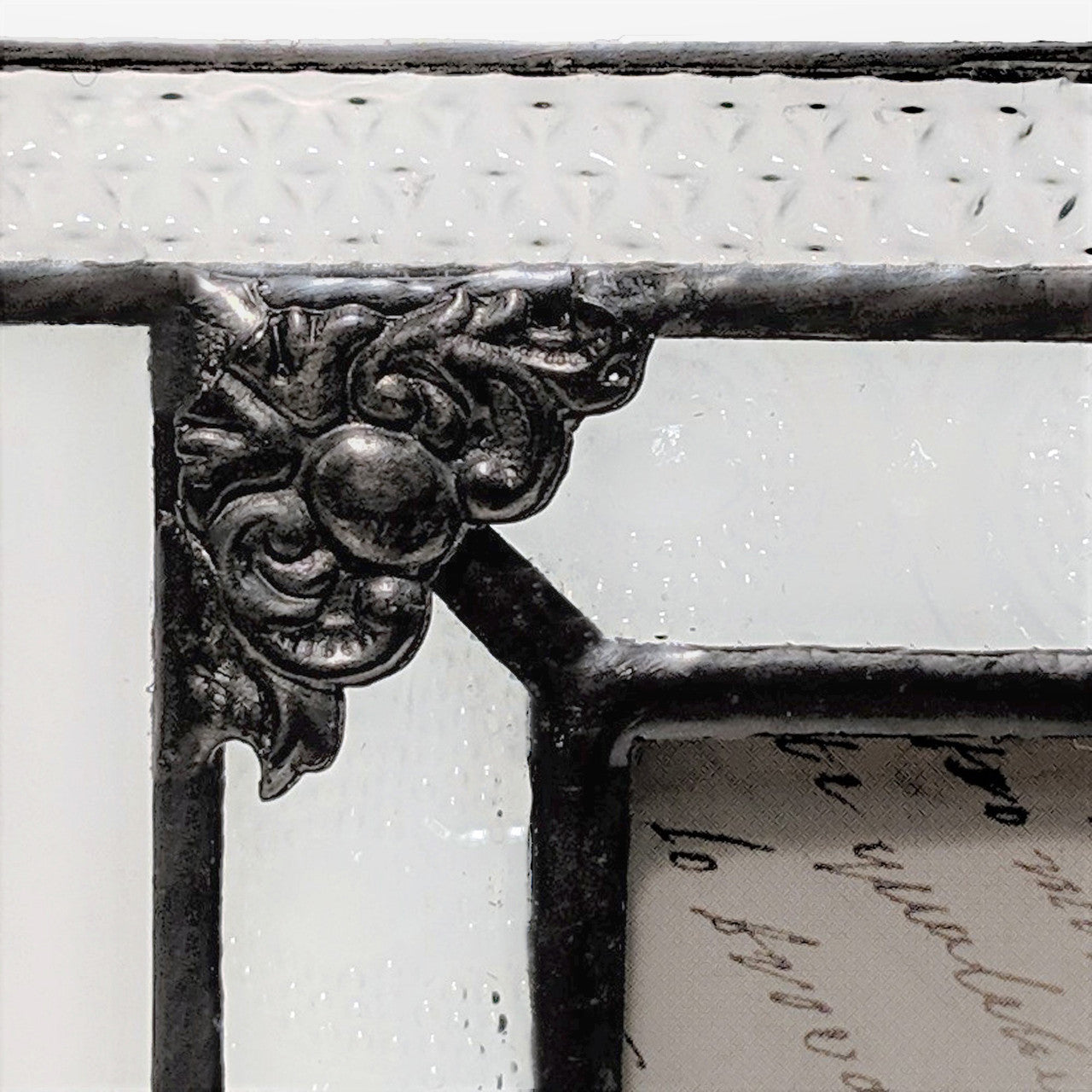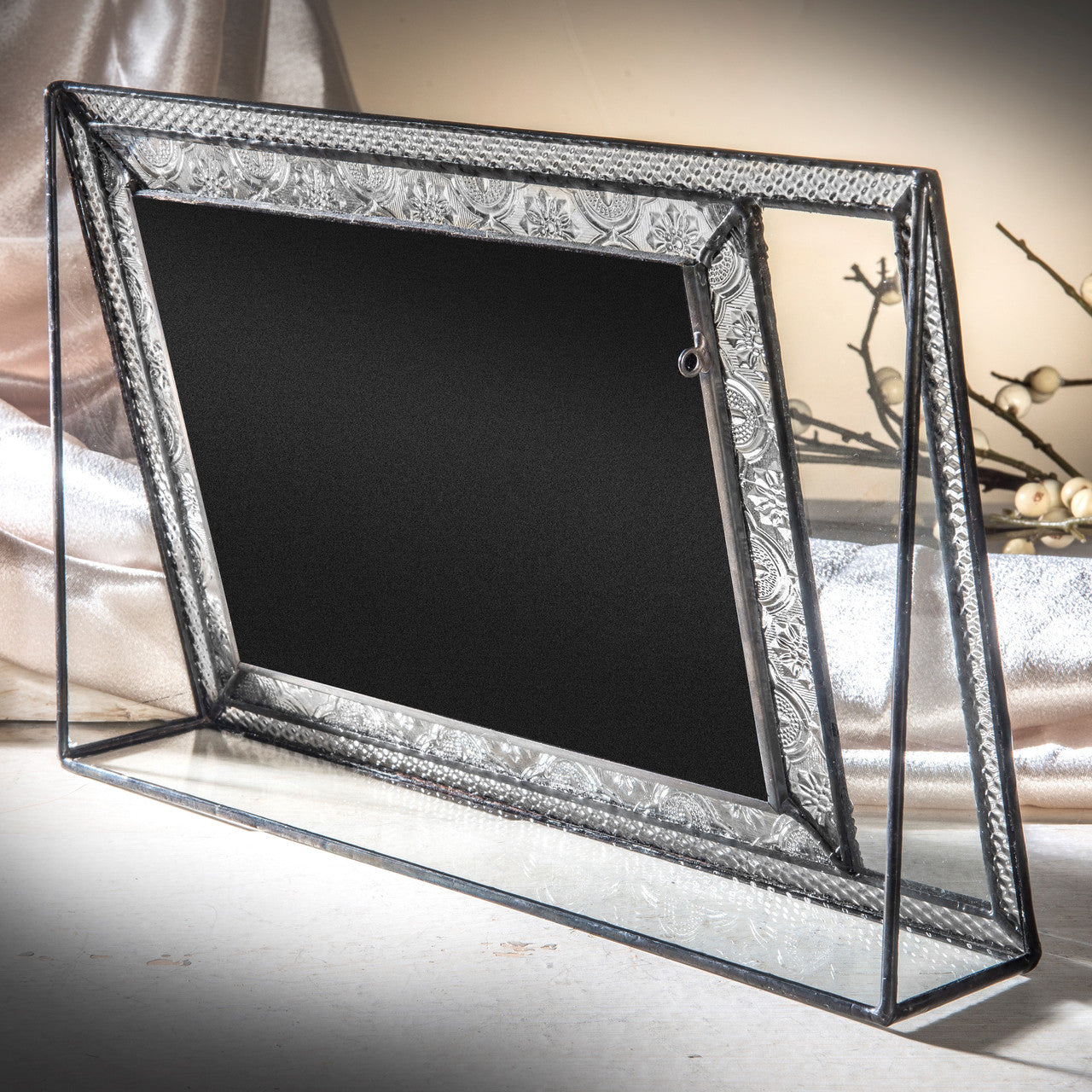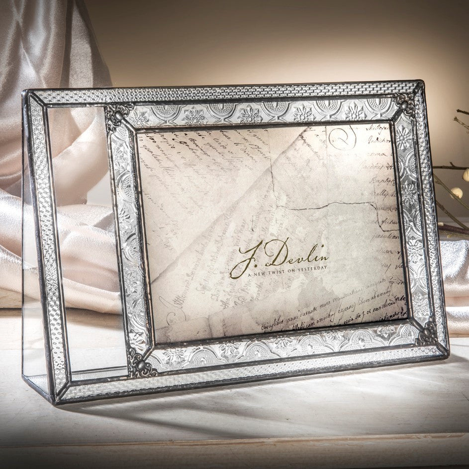This picture frame features a clear glass embossed with a vintage texture trimmed with metal filigree accents surrounding a 4x6 horizontal (landscape) photo. Clear glass sides provide stability and style unique to J Devlin frames. It is ascetically pleasing from all angles and your photo can be easily inserted into the back.