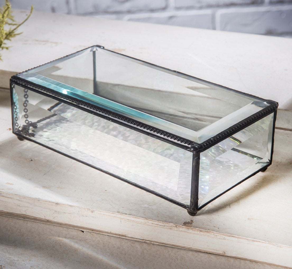 House larger pieces of jewelry like necklaces and earrings in this sophisticated beveled glass jewelry box. It features clear beveled sides and lid with a clear iridescent glass bottom. This decorative glass box can be placed together or alone, or among any assortment of fine glass home decorations from J. Devlin. The soft iridescent glass and clean design of this large glass keepsake box makes it perfect for any room and any occasion. Feel comfortable to know that all J Devlin products are made with lead free solder to protect you and the environment.