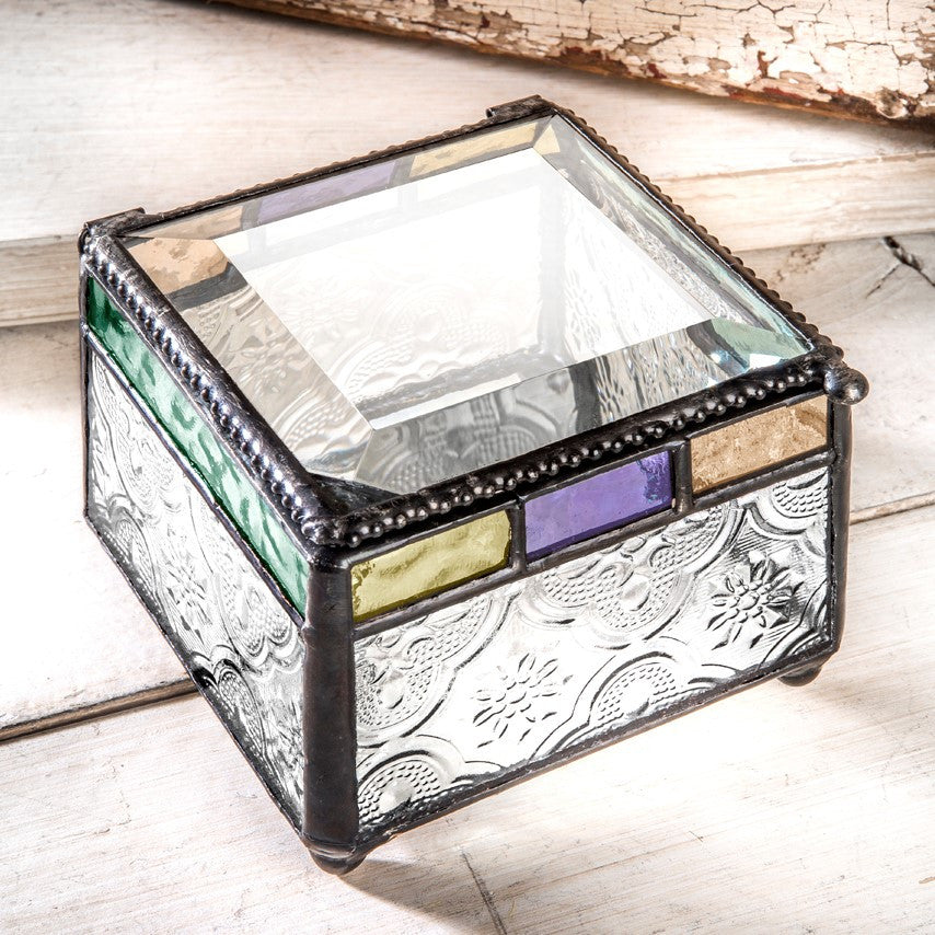 Embracing the arts and crafts style this colorful stained glass box features a clear glass embossed with a vintage texture and accented with shades of turquoise blue, green, peach and purple. Clear iridescent glass in the bottom shimmers with color when you open the lid. Decorative metal edging on the hinged lid, round ball feet and a chain on the inside that supports the top when it is open are all part of the quality detailing. It’s a decorative and functional gift for a girl or woman of any age. All J Devlin products are made with lead free solder to protect you and the environment. The metal trim and solder have also been stained with an antique charcoal patina and a wax applied to this glass box keeping it beautiful for years to come. Polish with a soft dry cloth if necessary. Each stained glass box is carefully handcrafted by skilled artisans using a copper foil and solder technique developed by Louis Comfort Tiffany in the late 1800’s. This age-old art form combined with 21st century designs creates the perfect combination for unique home décor. J DEVLIN - has been designing and manufacturing quality glass home decor since 1999.