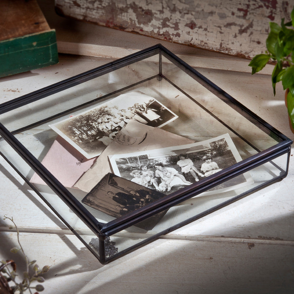 Spread your keepsakes out in this shallow (interior is 1 1/2" deep) clear glass display box. Don’t let those favorite mementos from the kids, vacations or the keepsake from grandma sit in the bottom of a drawer. Keep them on display to warm your heart with memories. With clear smooth glass, black metal trim and angular box feet it has style. Decorative keepsake box ideal for the coffee table, end table, or dresser.
