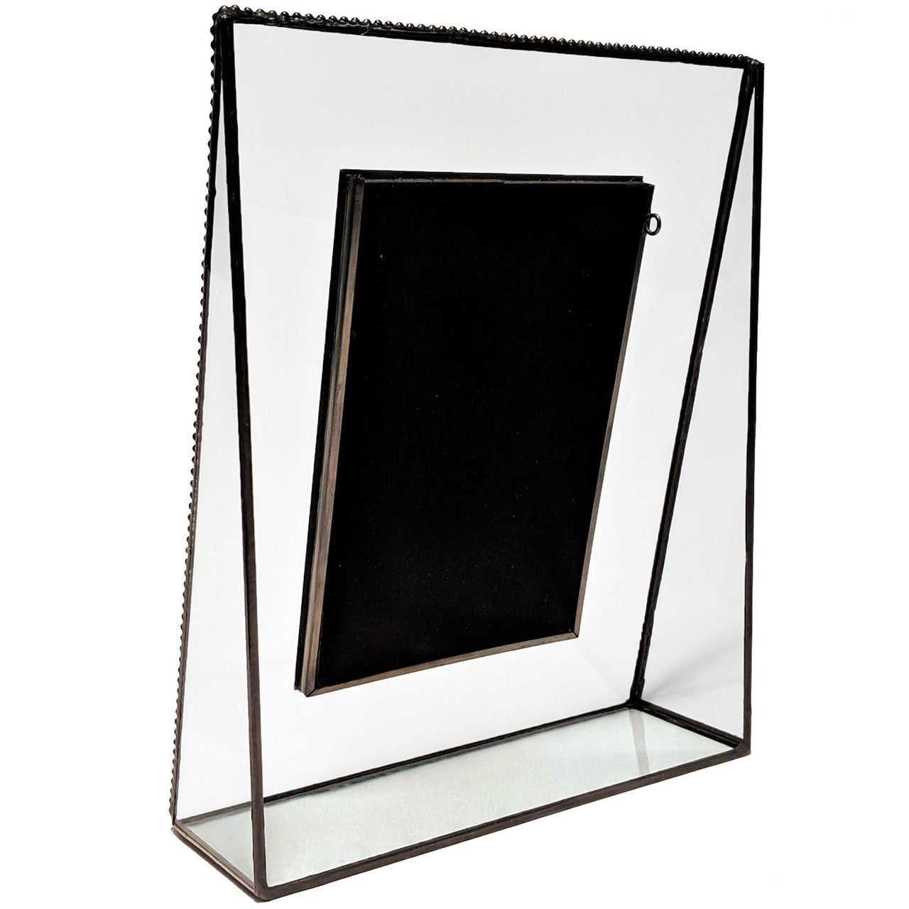 Beautiful in any setting, this picture frame features clear glass trimmed with a decorative metal edge. In addition, triangular glass sides provide stability and style creating a frame that is ascetically pleasing from all angles. The metal trim and solder have been stained with an antique charcoal patina and waxed keeping it beautiful for years to come. Made with lead free solder to protect you and the environment. Each picture frame is carefully handcrafted by skilled artisans using a copper foil and solder technique developed by Louis Comfort Tiffany in the late 1800’s. This age-old art form combined with 21st century designs creates the perfect combination for unique home décor.