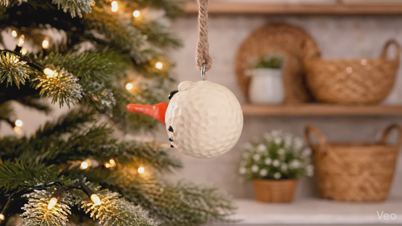 Give the golfer in your family an ornament they're sure to remember. This Bert Anderson snowman is like no other. His face is a golf ball with shiny black eyes and coal smile. His nose, a golf tee, completes this unique ornament. Shop a wide range of dangly snowman ornaments from the Bert Anderson collection. They range in sizes, with this dangly golf snowman ornament measuring 2".