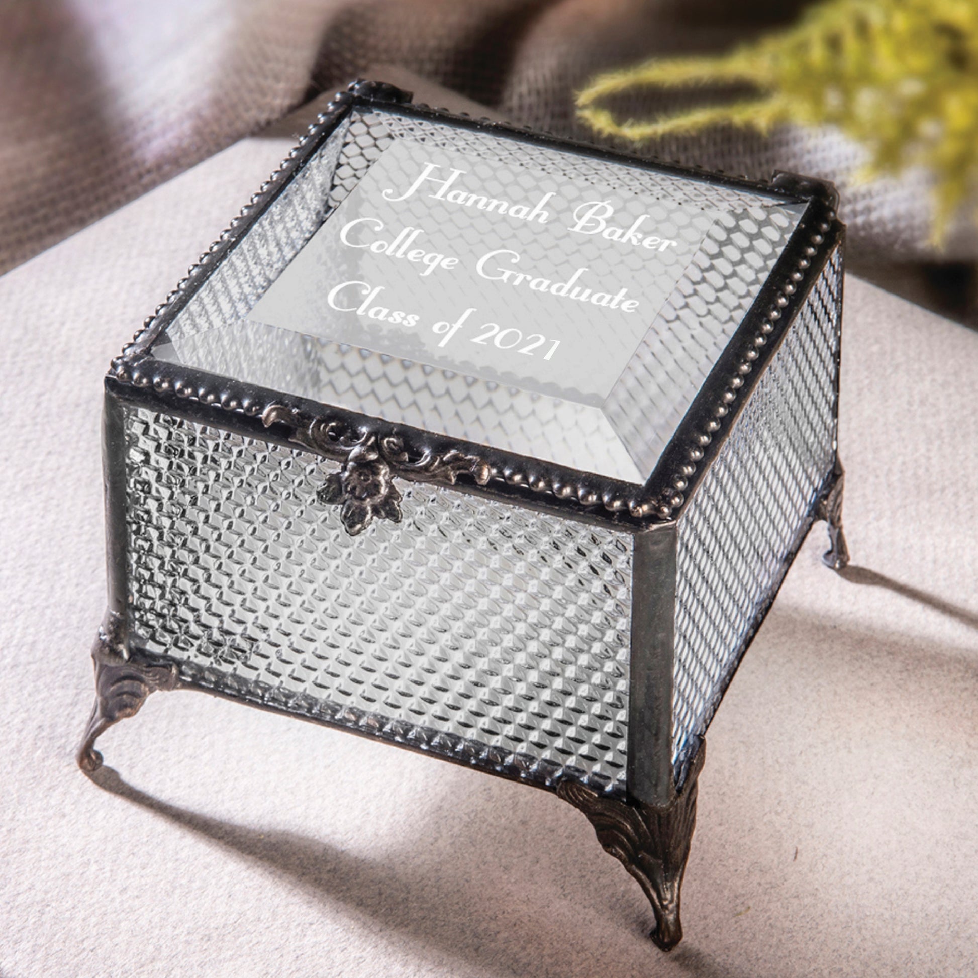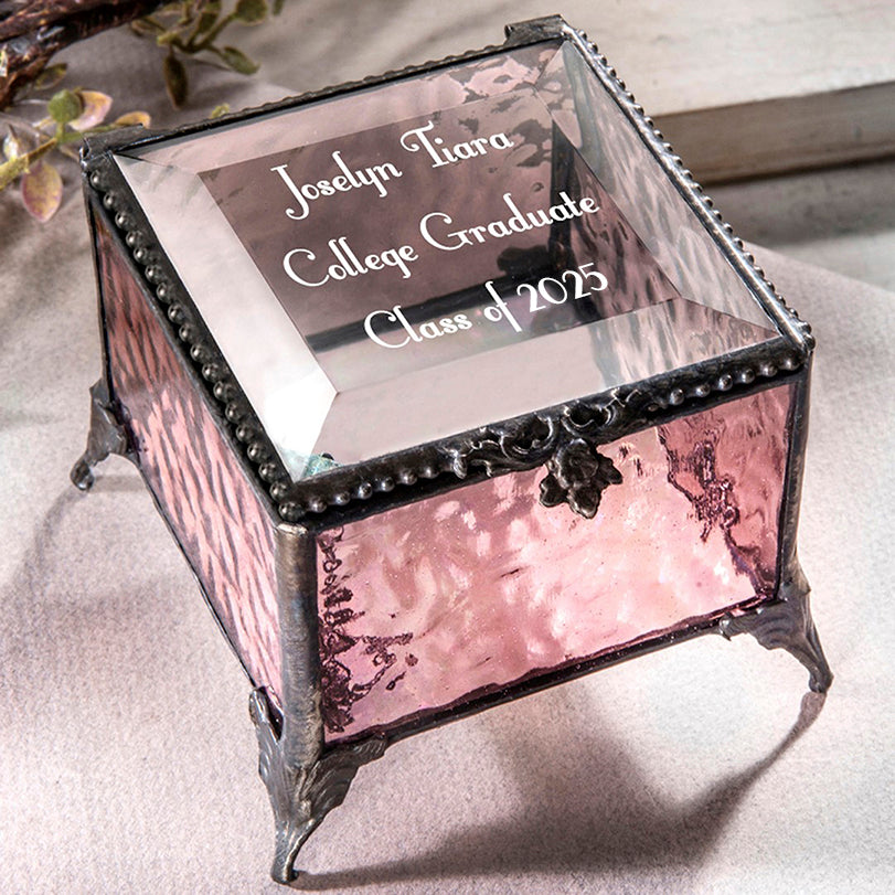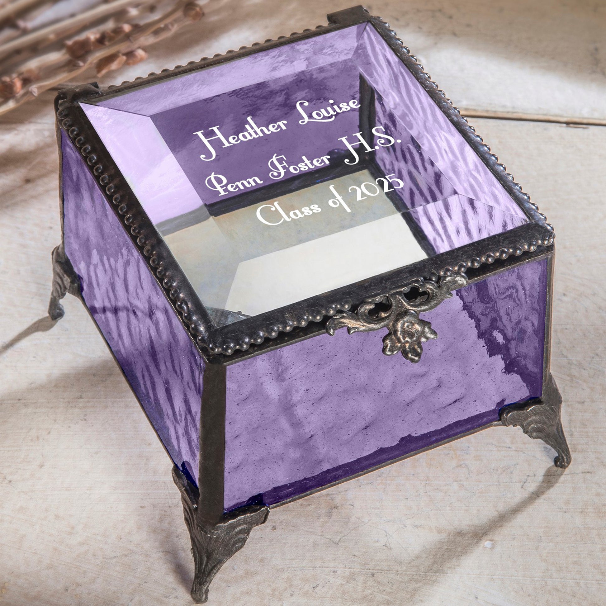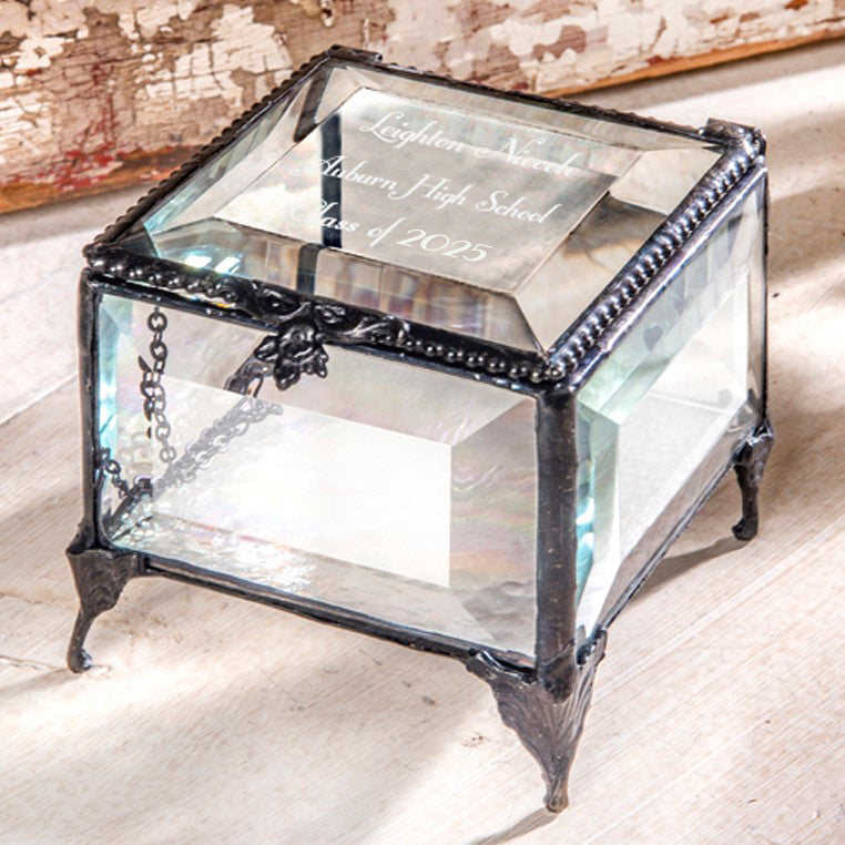 This jewelry box is offered in several colors all have clear a beveled top with a clear iridescent glass bottom that shimmers with a rainbow of colors.
