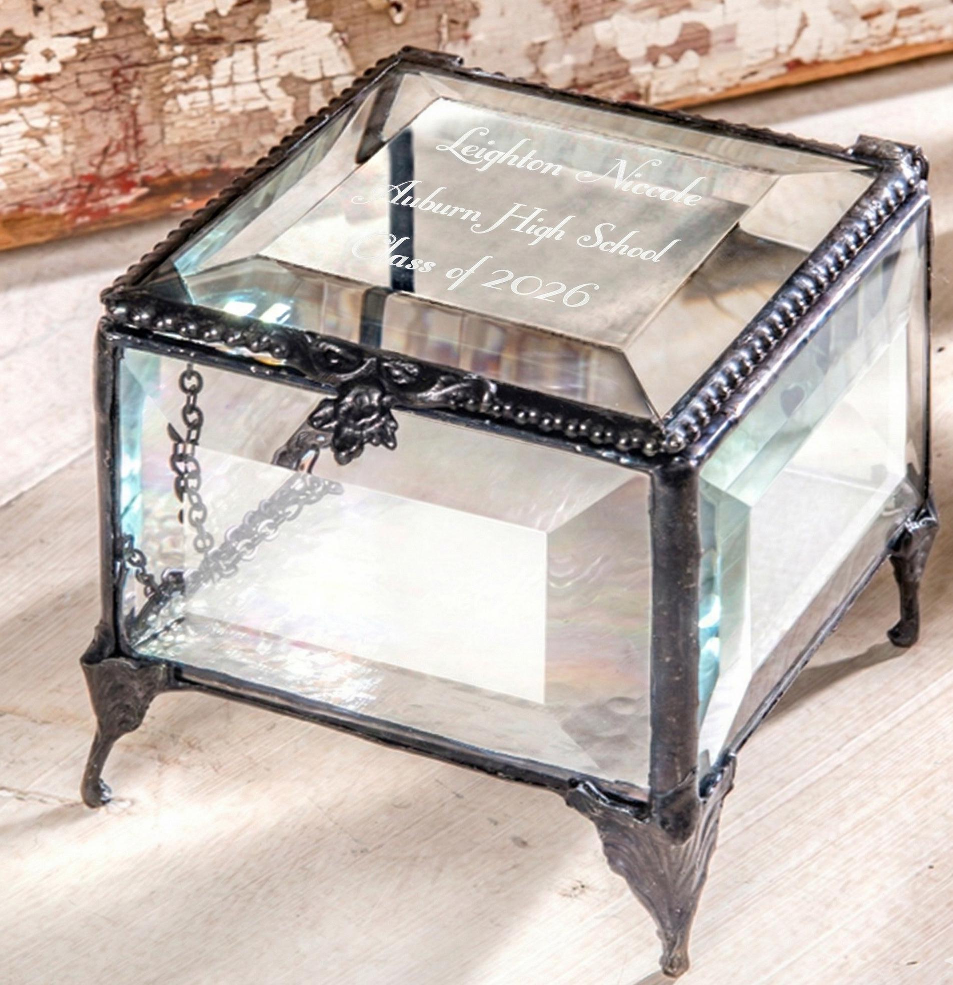This jewelry box is offered in several colors all have clear a beveled top with a clear iridescent glass bottom that shimmers with a rainbow of colors.