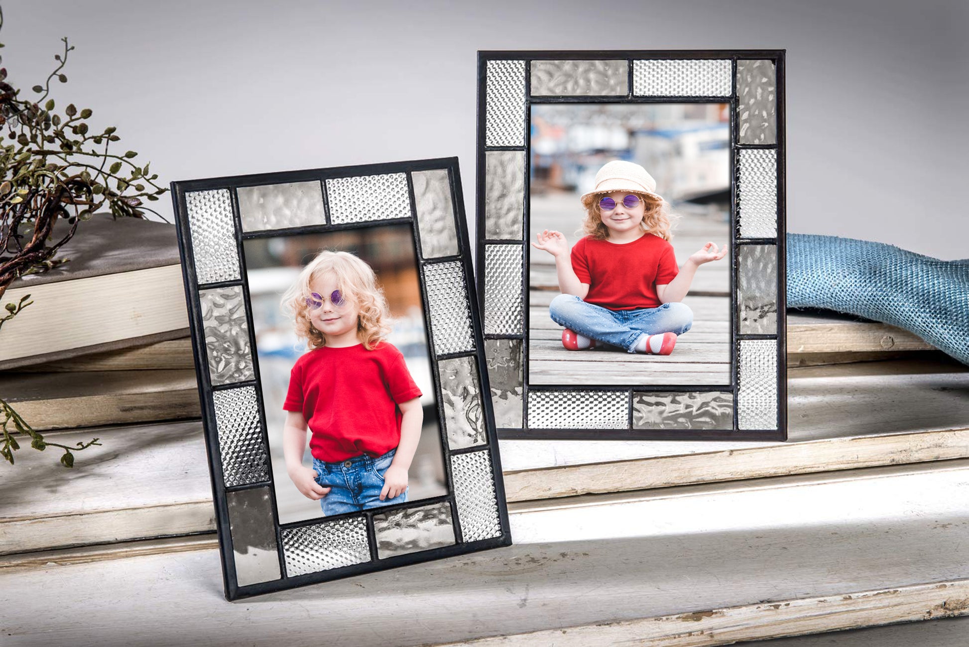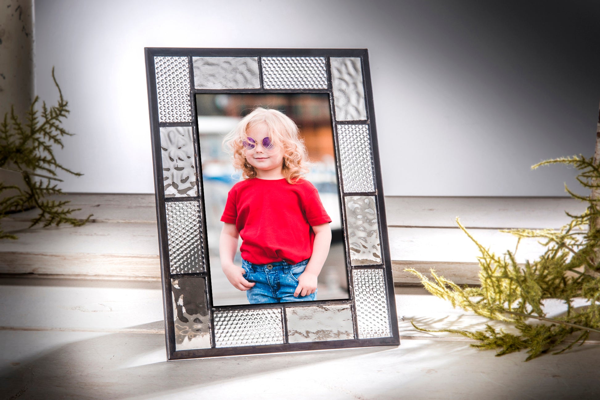 Simple clean lines paired with a soft grey translucent and clear textured glass creates a frame that will blend with any home decor. Add a cherished photo and this picture frame becomes a memorable gift for a men or women. Each piece is carefully handcrafted by skilled artisans using a copper foil and solder technique developed by Louis Comfort Tiffany in the late 1800’s. This age-old art form combined with 21st century designs creates the perfect combination for unique home décor.