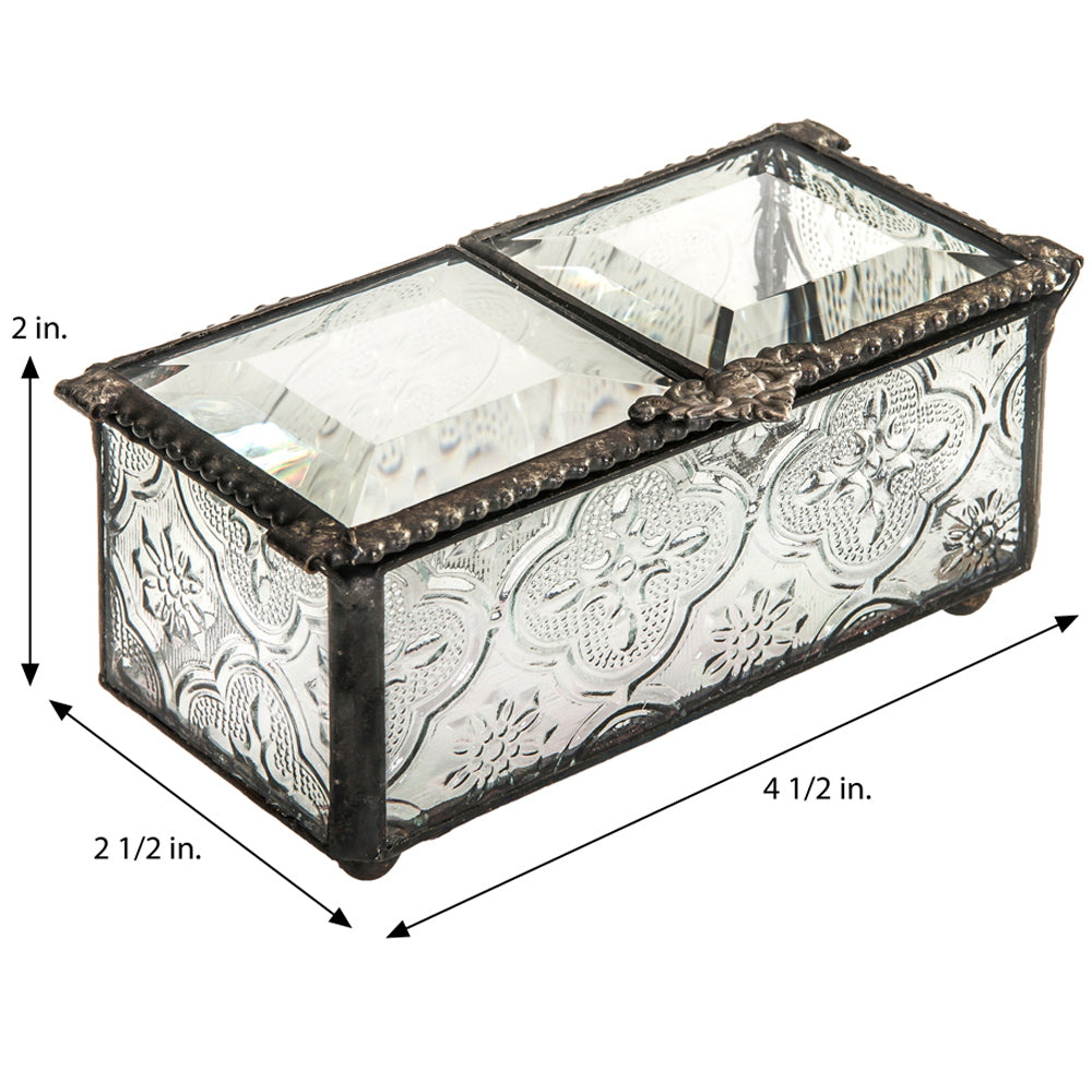 Sophisticated and timeless, this glass antique-looking box features a unique double-lid design. Both lids open toward the side, revealing any number of treasures inside. From small family heirlooms to jewelry to any other small keepsakes of personal significance, display your most precious possessions in style. Each glass box is carefully handcrafted by skilled artisans using a copper foil and solder technique developed by Louis Comfort Tiffany in the late 1800’s. This age-old art form combined with 21st century designs creates the perfect combination for unique home décor.