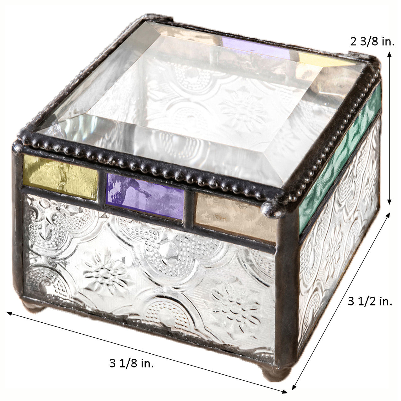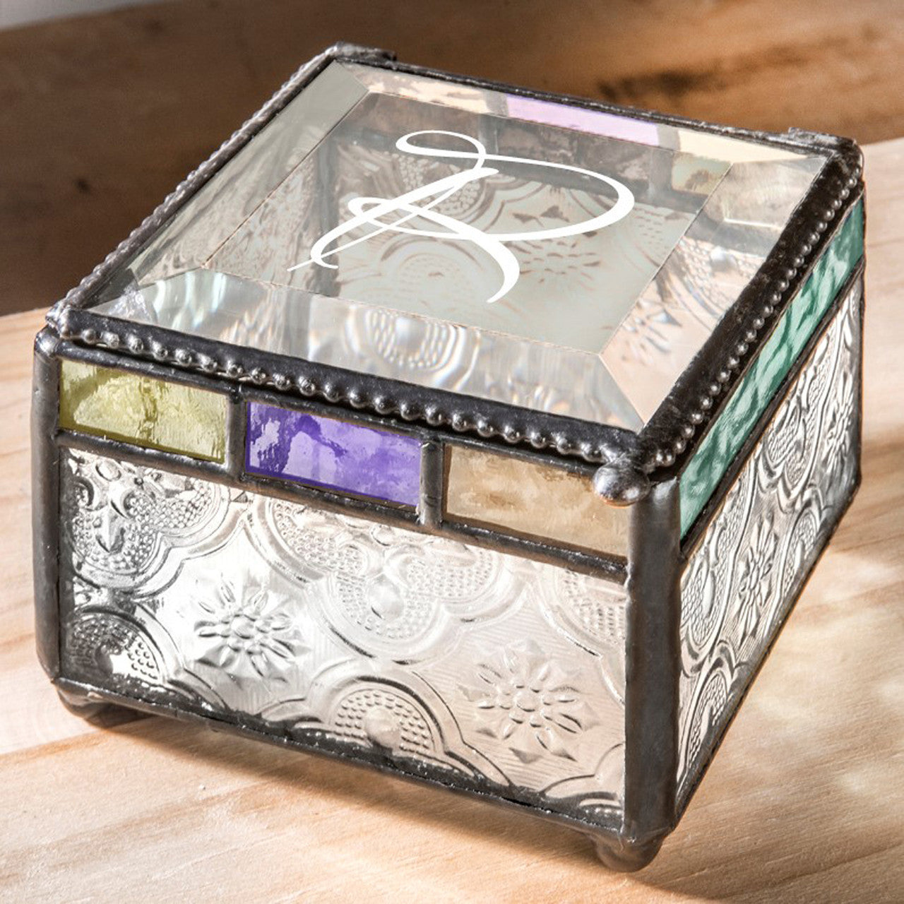 Personalized gifts make lifetime keepsakes! Whether you are looking for a box to fit your home décor or to give as a gift, this will be perfect to showcase those favorite jewelry pieces, trinkets or treasures. Monogram this keepsake box with an initial and use as a gift with that added touch of thoughtfulness for your mom, friend, wife, daughter, sister or girlfriend. Lettering will be engraved and will appear in white frost on the clear beveled glass top. Embracing the arts and crafts style this colorful stained glass box features a clear glass embossed with a vintage texture and accented with shades of turquoise blue, green, peach and purple. Clear iridescent glass in the bottom shimmers with color when you open the lid. Decorative metal edging on the hinged lid, round ball feet and a chain on the inside that supports the top when it is open are all part of the quality detailing. Use as a jewelry display case, ring dish, or a keepsake box for precious trinkets. It’s a decorative and functional gift for a girl or woman of any age. Each stained glass box is carefully handcrafted by skilled artisans using a copper foil and solder technique developed by Louis Comfort Tiffany in the late 1800’s. This age-old art form combined with 21st century designs creates the perfect combination for unique home décor.