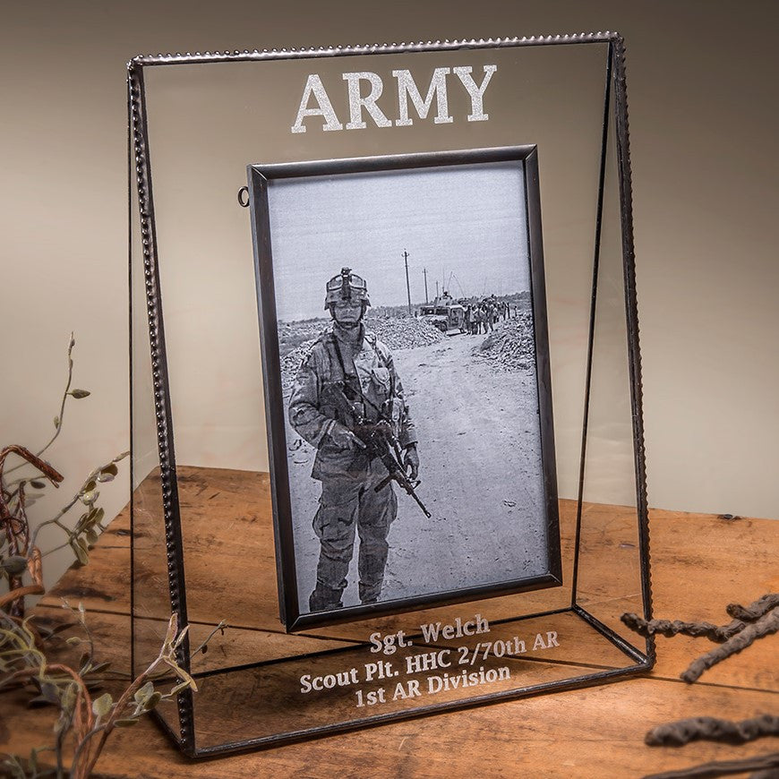 Personalized military gifts should be sophisticated and classy. Honor those serving our country with this personalized glass photo frame. Available in 4" x 6", 5" x 7" or 8" x 10" Personalize this unique glass photo frame: For the top panel, choose words like: "Army" or "Navy" or any other branch of the military. Then use the last three lines to include a name, title, or personal message. This classic glass photo frame can be given as a gift or for yourself to keep a reminder of your loved one close by.