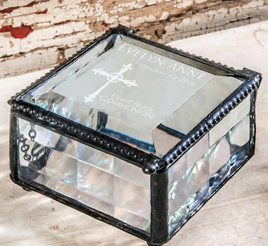 Sophisticated and classy this keepsake box is available in several color offerings all have an iridescent glass in the bottom that streams soft pastel colors through the crystal beveled top.