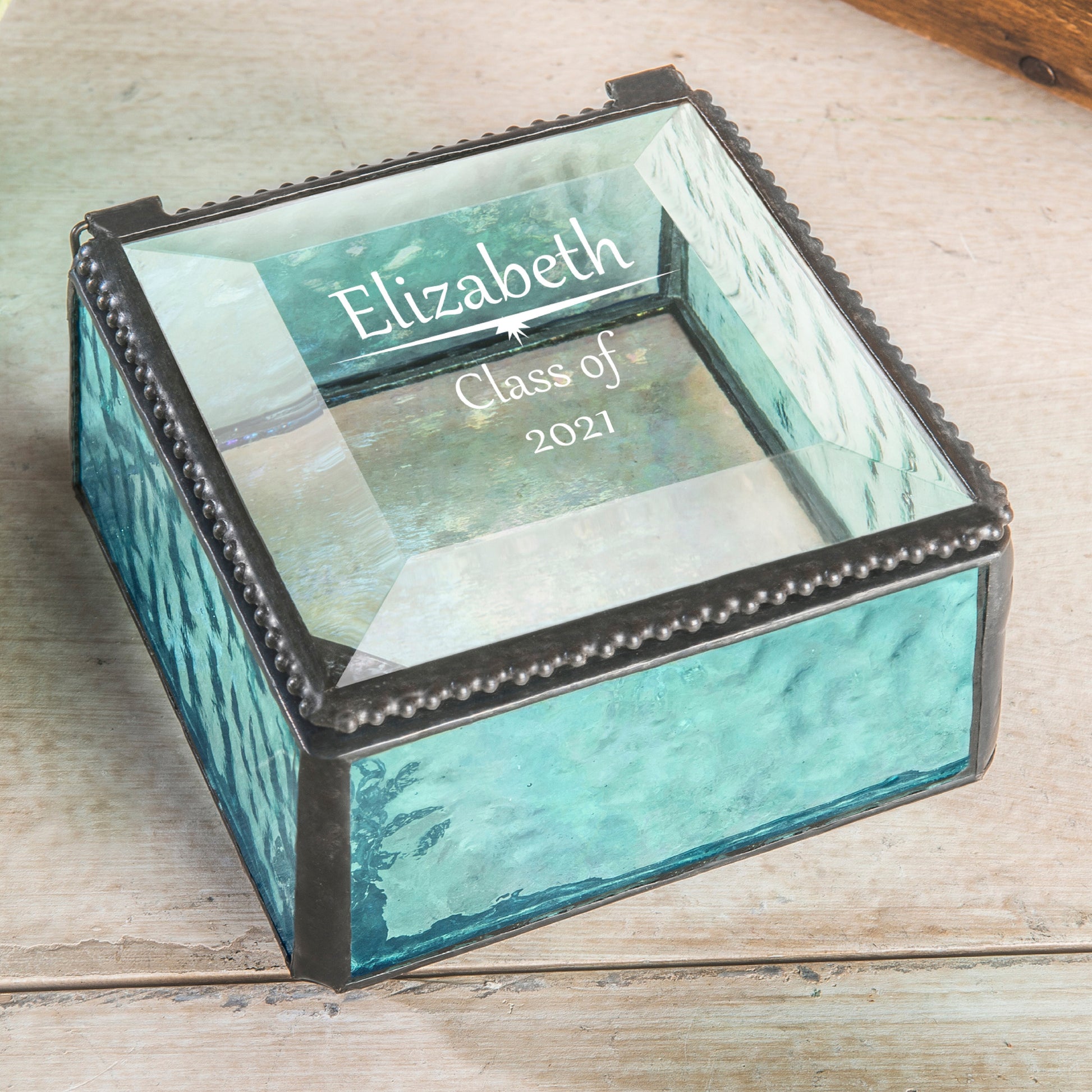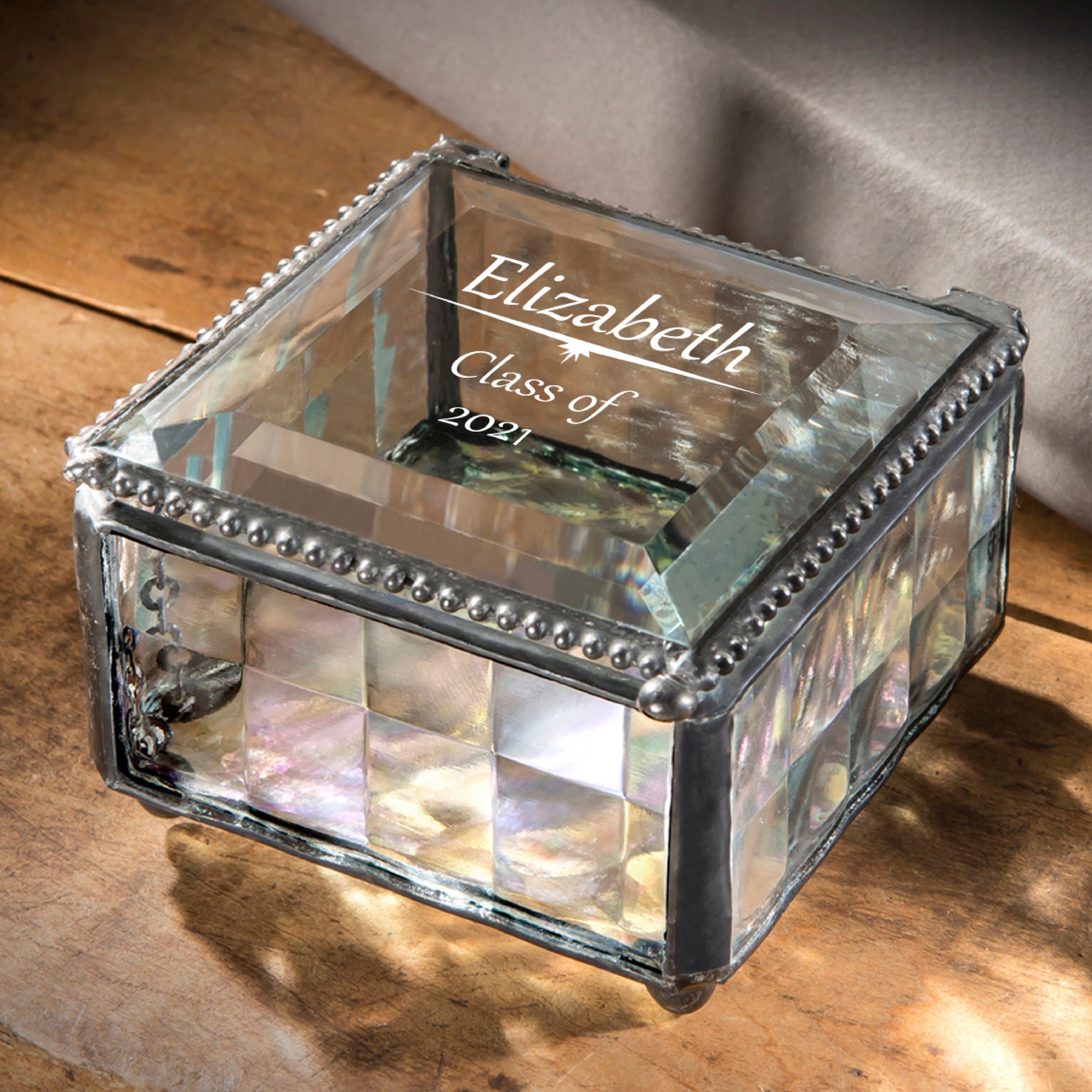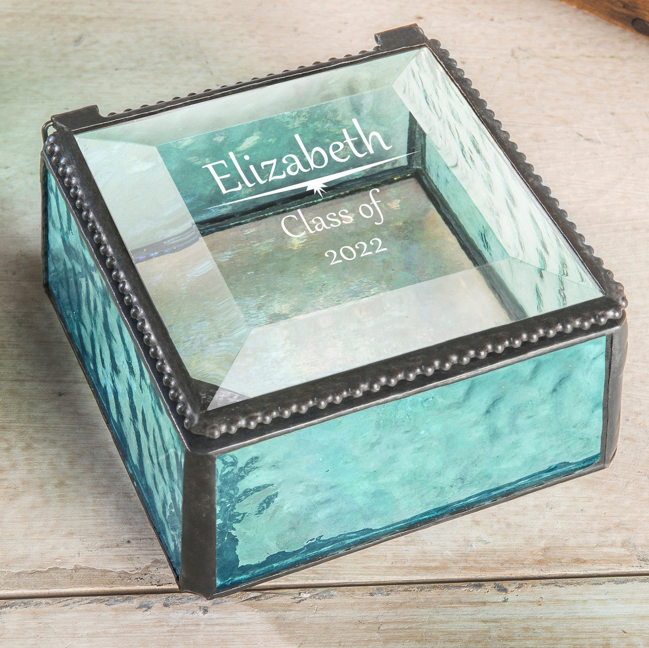Personalized graduation gifts make lifetime keepsakes. Let us custom engrave this beautiful glass jewelry box for your daughter, granddaughter or friend.
