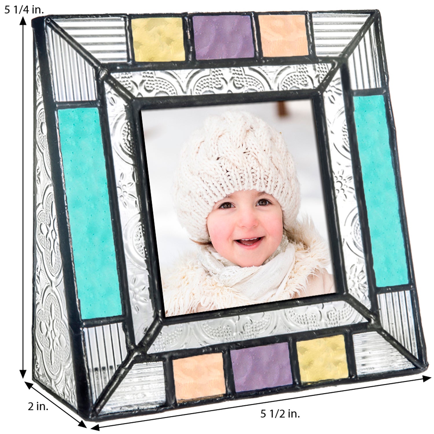 Embracing the arts and crafts style this colorful stained glass picture frame features shades of turquoise blue, green, peach and purple surrounded by a clear glass with an embossed vintage texture.