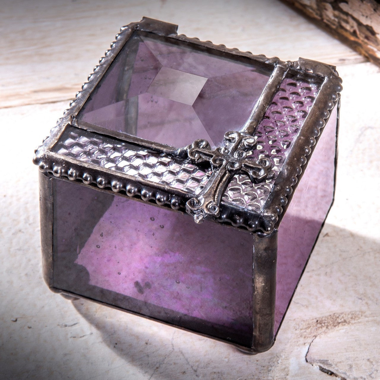 Featuring a rich purple stained glass this keepsake box sits on round ball feet and has a hinged lid with a chain on the inside to support the top when it is open. With the sign of our Christian faith a metal filigree cross is placed on the top making this ideal for a Baptism, Confirmation, Christening or First Communion gift. Use as a rosary box or for rings, trinkets or treasures. This unique glass jewelry box is the perfect gift for a special religious celebration or let it be an addition to your vanity, dresser or night stand. Each glass box is carefully handcrafted by skilled artisans using a copper foil and solder technique developed by Louis Comfort Tiffany in the late 1800’s. This age-old art form combined with 21st century designs creates the perfect combination for unique home décor.
