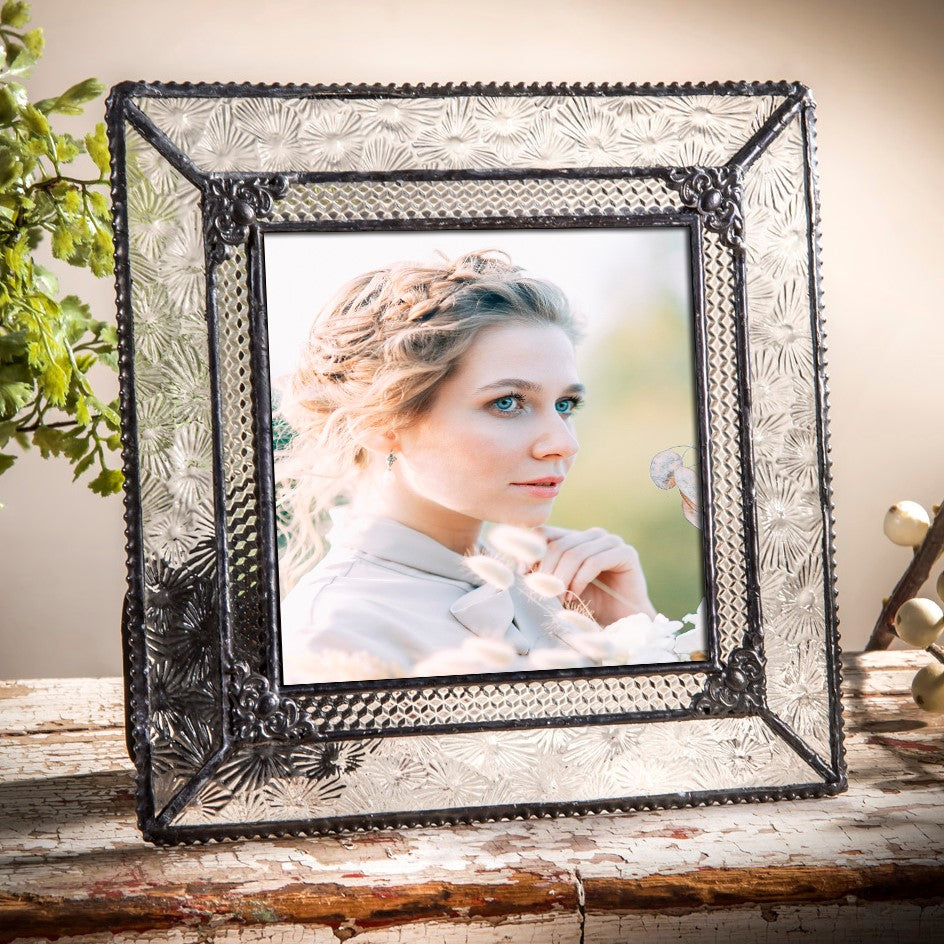 Clear glass with an embossed vintage texture is accented with intricate filigree and supported by an easel back, making it versatile for horizontal or vertical photos. This 8x10 tabletop frame is nicely suited for a wedding frame and would be a treasured keepsake gift by any couple.